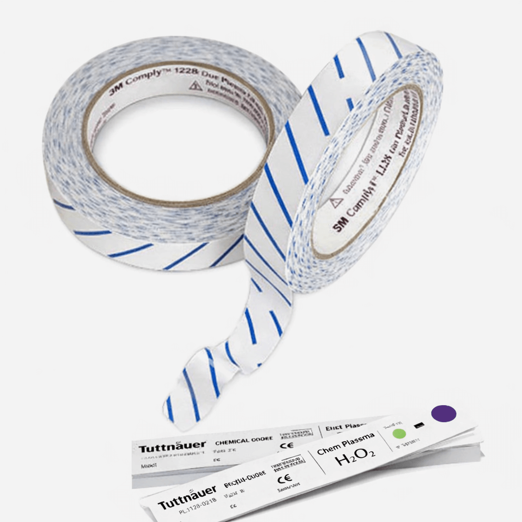 The set includes hydrogen peroxide cassettes and Plasmax-compatible sterilization indicator tape for cycle verification.